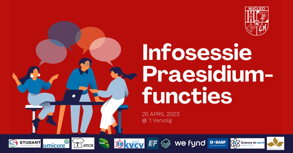 Zie jij jezelf in ons praesidium? Of heb je nog vragen en twijfels? Dan is deze infosessie perfect voor jou! Op maandag 20 maart organiseren we een infosessie over het praesidium. Deze zal starten om 20:00 in ons stamcafรฉ โt Vervolg.