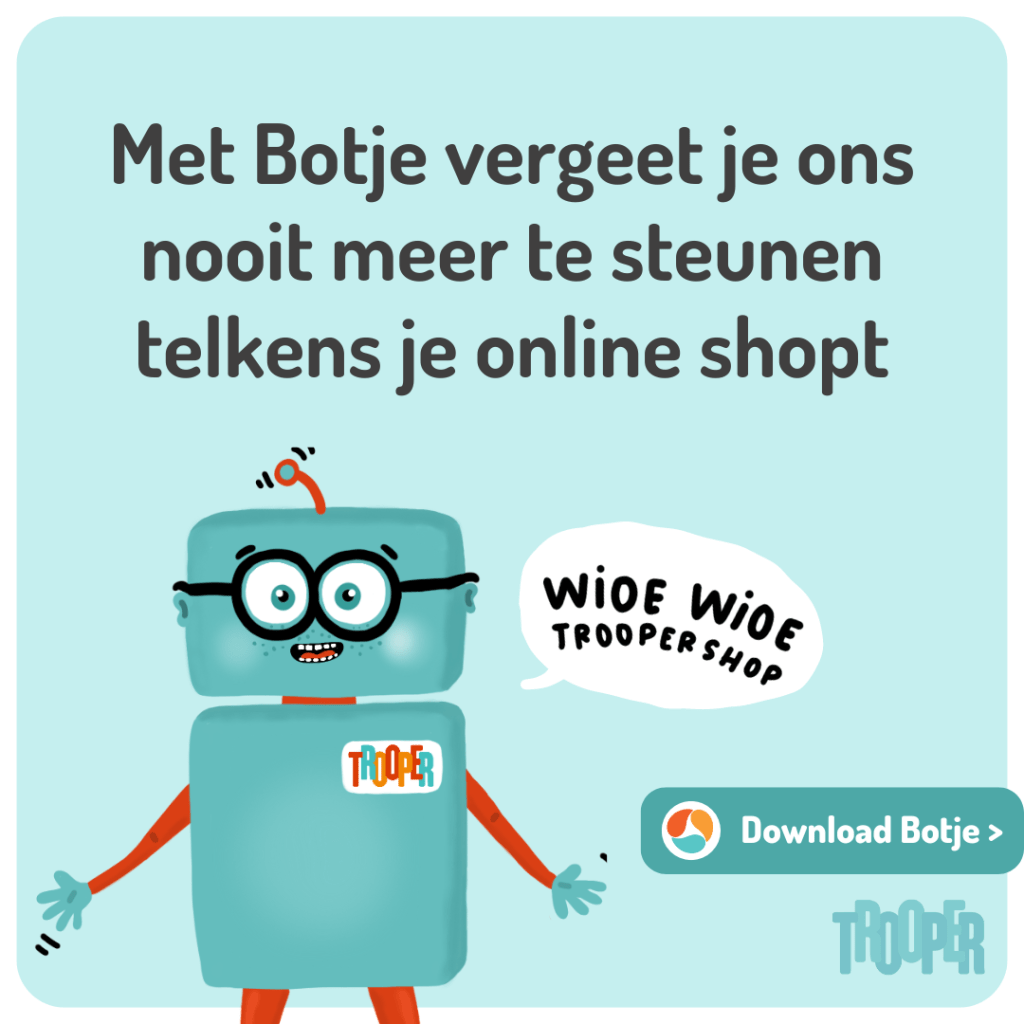 Botje is een extensie die je makkelijk en gratis op je computer kan downloaden in je Google Chrome browser. De installatie wijst zichzelf uit. Eens geïnstalleerd komt ons Botje piepen wanneer je op een Trooperwebshop zit en herinnert hij je eraan te troopen.